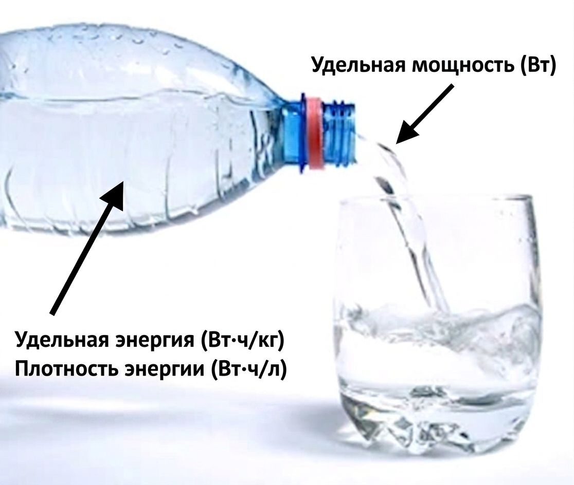 Удельная мощность (гравиметрическая плотность мощности) отражает способность аккумулятора работать под большой нагрузкой, то есть отдавать высокие токи без чрезмерного падения напряжения. Например, батареи для электроинструментов специально оптимизируют под высокую удельную мощность, жертвуя частью удельной энергии, то есть общим временем работы. На условном рисунке 1 часто показывают аналогию: вода в бутылке символизирует запас энергии (удельную энергию), а ширина горлышка, через которое она выливается, — удельную мощность (то есть максимальную «скорость отдачи»).