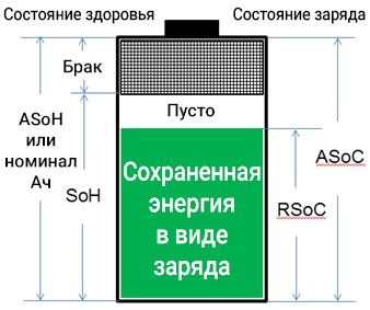 - ASoH (Absolute State of Health) — начальное состояние, когда аккумулятор новый и способен хранить полную «паспортную» энергию
