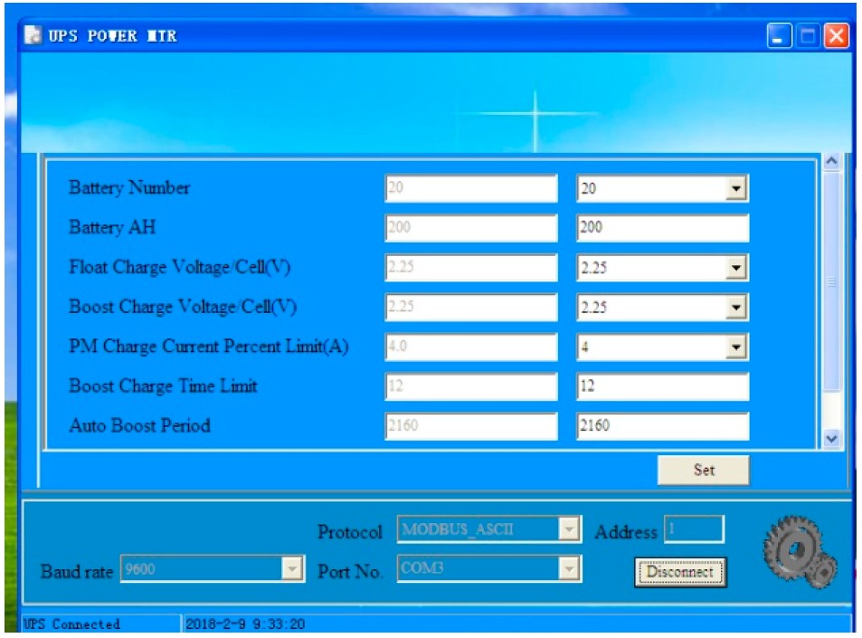 2.1 За допомогою програмного забезпечення ви можете встановити кількість використовуваних батарей, ємність батарей (в Аг), обмеження струму заряду і вирівнюючу напругу буферного заряду і підтвердити їх, натиснувши кнопку Set.