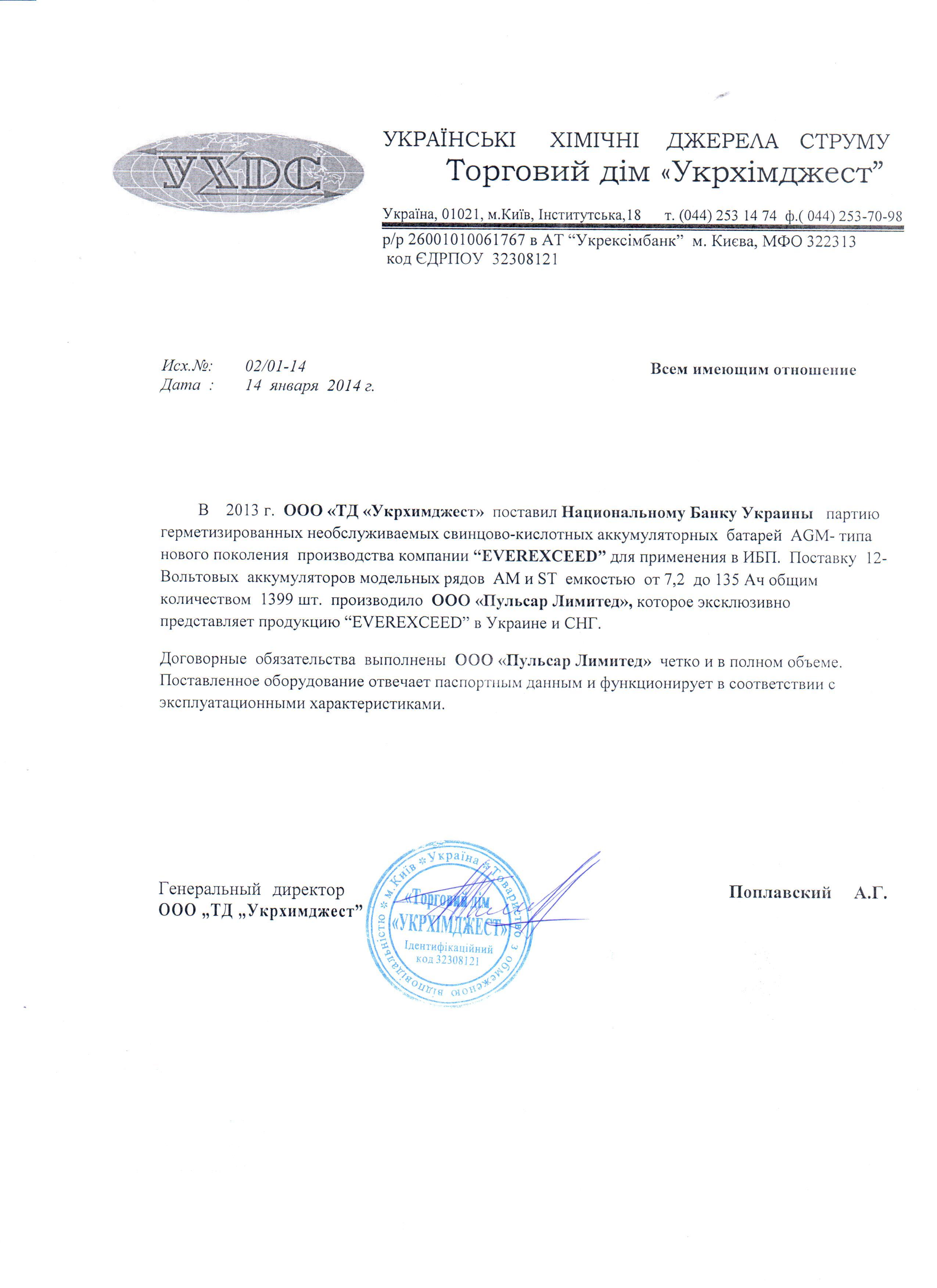 Національний Банк України - 2013 р. - постачання AGM-акумуляторів EverExceed для ДБЖ (12 В/ 7...135 Аг) загальною ємністю близько 50.000 Аг.